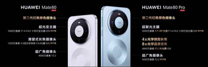 - mate80 pro:5000万像素可变光圈主摄(1/1.28英寸)+4800万像素4x潜望长焦(支持微距)+4000万像素超广角+第二代红枫原色摄像头;