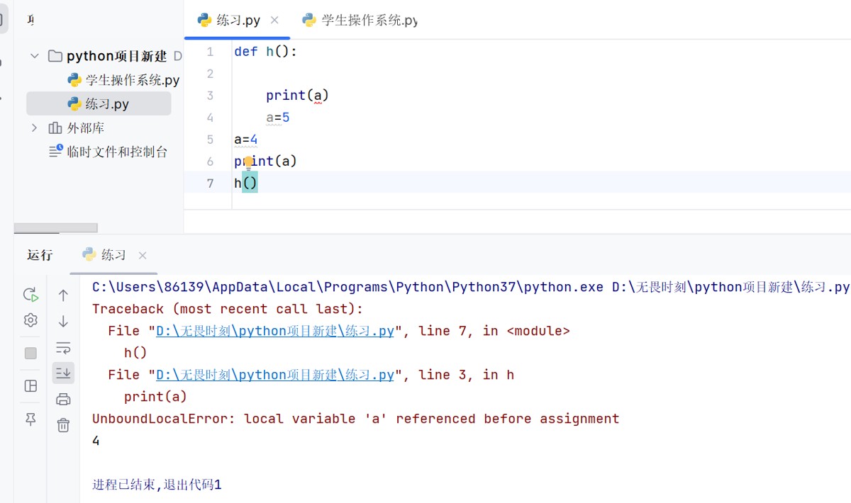 ②函数内定义了同名局部变量时,该变量会被标记为局部变量,且 python没有 “变量提升” 机制(和 javascript 不同),必须先定义再使用,否则报错。