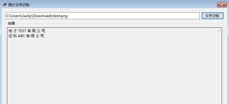 运行程序,输入图片路径,点击 “文字识别” 按钮,很快地就自动识别出图片上的文字,并输出结果,如下图: