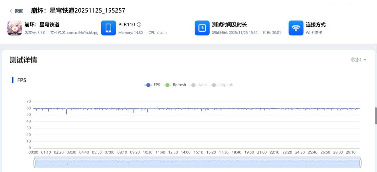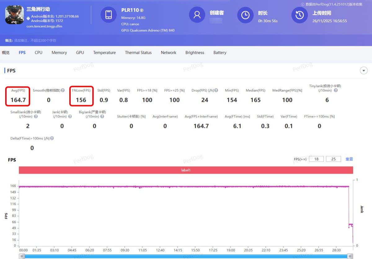 进入游戏后我们开一局“搜打撤”模式,30 分钟后游戏平均帧数高达 164.7 帧,帧率曲线非常平直,1% low 竟然也达到了 156 帧!无论是在搜寻物资还是激烈对战中,帧数输出始终保持一条直线,画面视觉和触控操作都非常流畅。