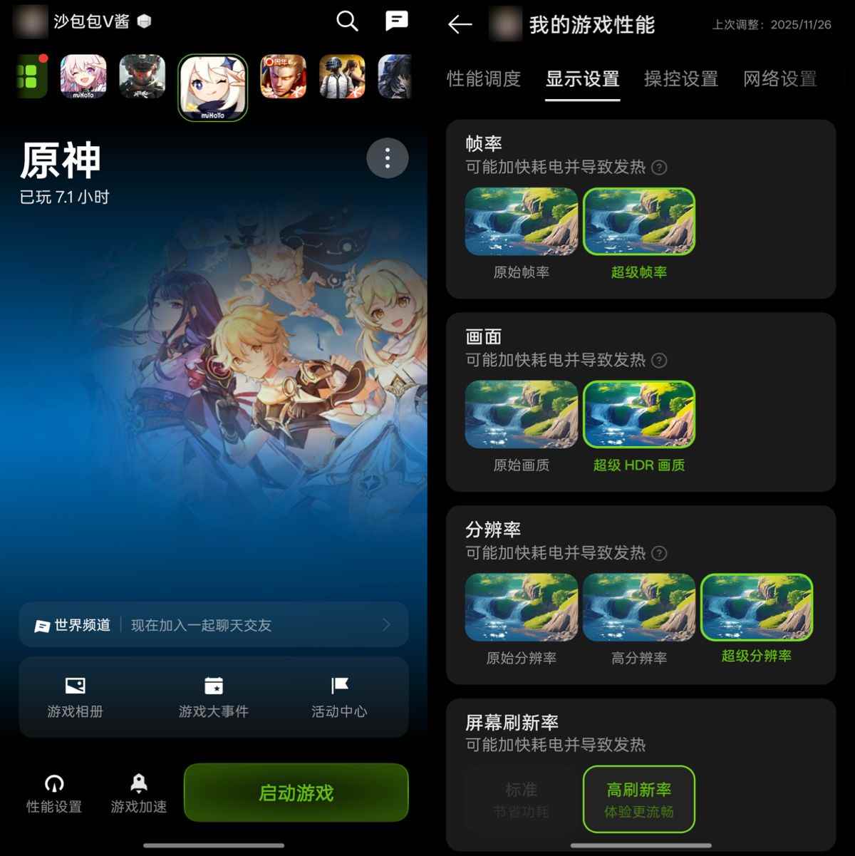 最后一款游戏,我们选择了优化相对比较成熟的《原神》,在原生画质和帧数设置下它早已脱离了高负载手游 行列。不过,目前《原神》依旧不支持高刷,刷新率依旧只有 60hz,因此我们通过一加的游戏助手,为它解锁 1080p 高分辨率 + 120hz 高帧率,考察一下一加 ace 6t 的超分超帧并发效果。