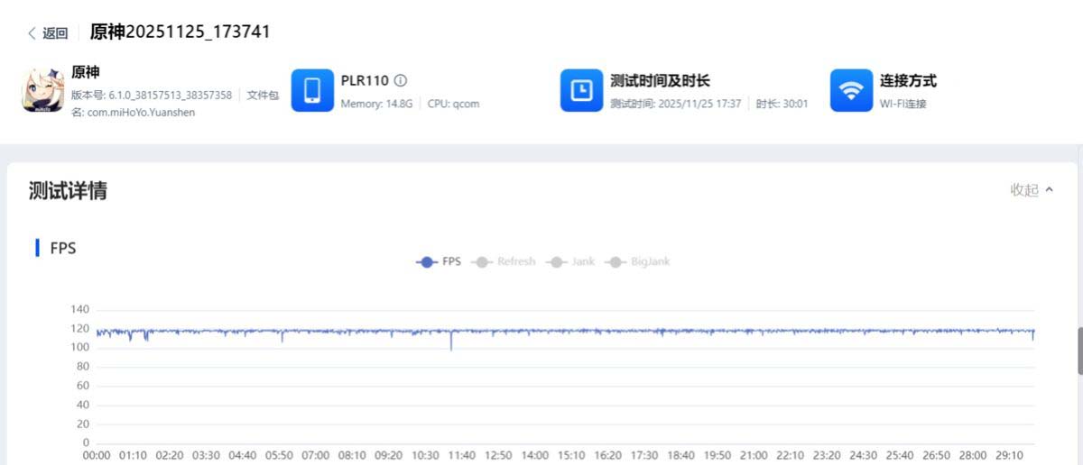 测试场景我们选择的是须弥城,经过 30 分钟的跑图测试,《原神》的游戏平均帧数为 119 帧,帧率曲线依旧稳稳一条直线。看来,即使将游戏助手中的所有选项拉到最高,一加 ace 6t 依旧能够轻松驾驭这款游戏。