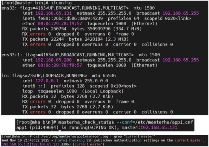 查看master 的 vip 地址 192.168.65.200 是否存在,这个 vip 地址不会因为 manager 节点停止 mha 服务而消失。 ifconfig