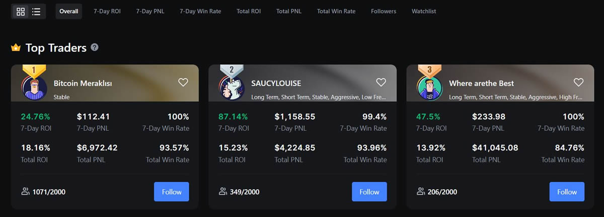 要成为关注者,您只需根据其表现和历史交易记录选择您喜欢的领头交易员即可。mexc 会让您查看其 7 天投资回报率 (roi)、7 天盈亏 (pnl)、7 天赢率、总投资回报率 (roi)、总盈亏 (pnl) 和总赢率等信息。这些信息可以帮助您决定关注哪些人。