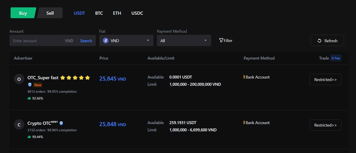 该交易所目前支持三种法定货币:越南盾 (vnd)、俄罗斯卢布 (rub) 和韩元 (krw)。支持超过 30 种付款方式。您可以灵活选择方便的付款方式,例如银行转账或电子钱包。