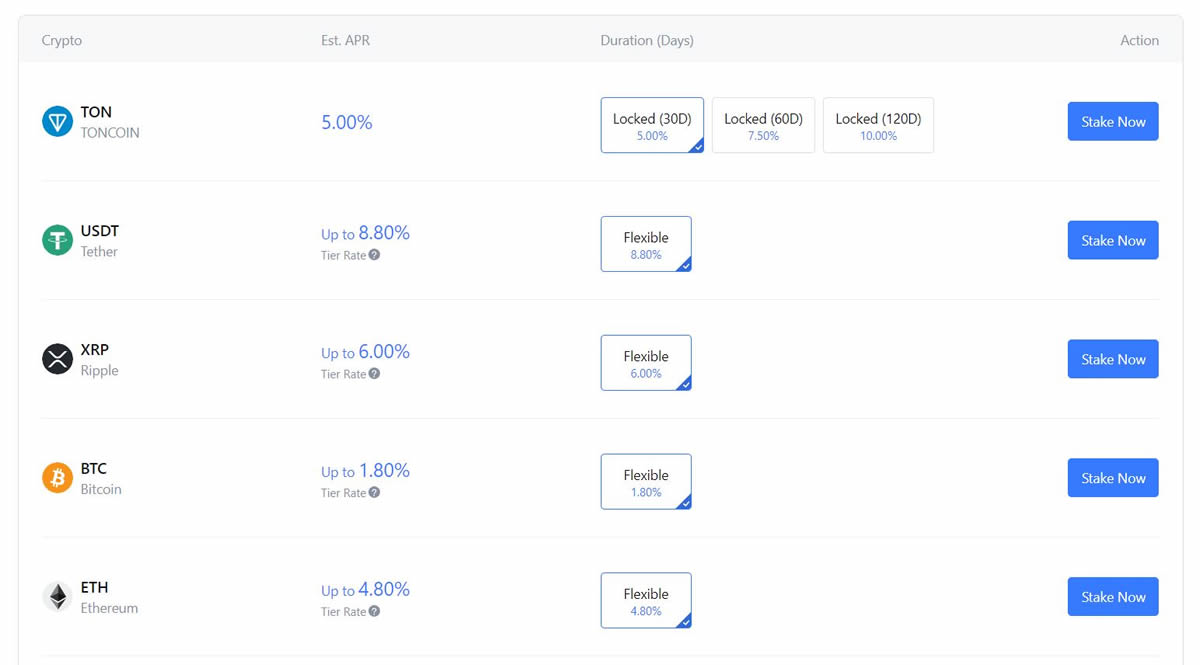 该平台提供固定和灵活质押选项,以及加密货币贷款。您可以借出您的加密货币持有并赚取利息。这类似于将钱存入储蓄账户。