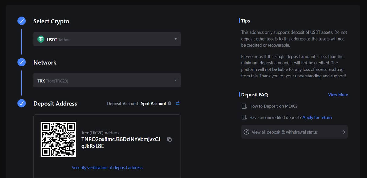 - 确认后,加密货币将从您的其他平台转入您的 mexc 账户。交易可能需要几分钟才能完成,具体取决于区块链网络。