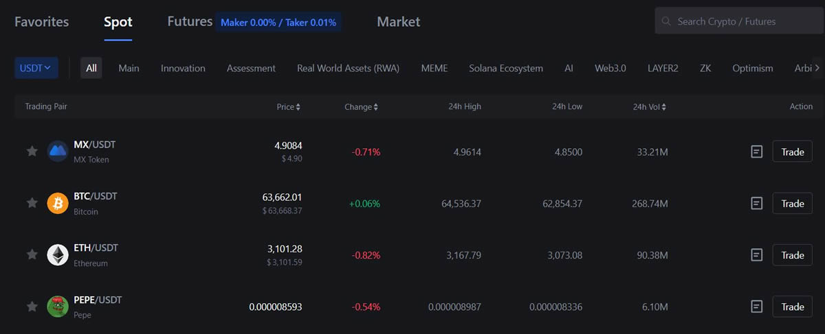 mexc 提供现货交易平台,您可以即时买卖各种加密货币。平台提供丰富的选择,涵盖超过 4000 种不同的数字货币,交易方式也更加丰富(超过 2600 个交易对)。