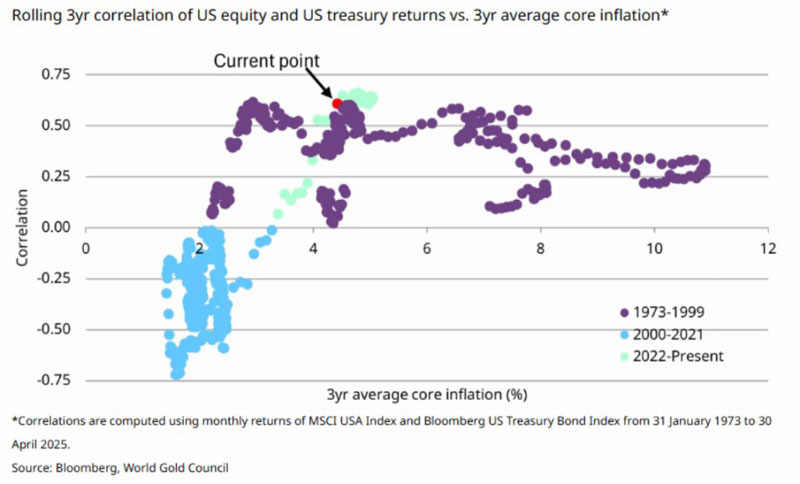 而一些大型长线投资机构的配置需求,也来自于」股债跷跷板「越来越多的失灵时刻:从 2022 年开始,股债出现更多正向相关性,与过去 20 年我们所熟悉的」股债 6:4 配置「叙事相背离: