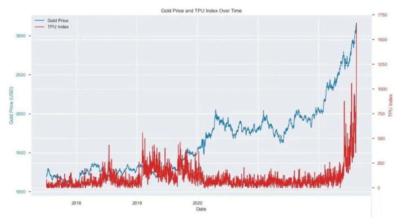 例如,美国债务迅速上升引发美元长远价值担忧,黄金可以在此类极端情境下充当」盾牌「。其次,在地缘政治冲突方面,黄金被视为动荡时期的安全港。每当发生战争或国际关系紧张,如 2018 年中美贸易战、2022 年俄乌战争、2025 年美国关税冲击,避险资金往往流入黄金推动金价上涨。经济历史回测研究也显示了近十年黄金价格和贸易政策不确定性(trade policy uncertainty index)之间的正向」幂律「关系: