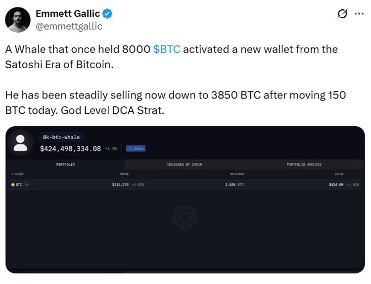 “一个曾持有8000枚btc的巨鲸激活了一个来自中本聪时代的比特币新钱包。他一直在稳步出售,现在在转移150枚btc后降至3850枚btc。神级dca策略,”他说。