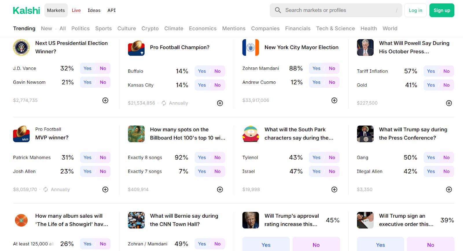 截至2025 年10 月,kalshi 平台上热门的预测事件有: