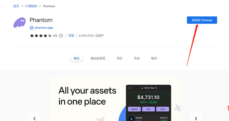 1、首先打开 phantom 钱包官网:https://phantom.app/,点击“download for chrome”。