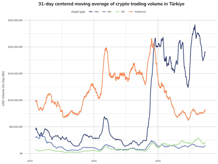 针对土耳其加密货币采用日益投机的性质,chainalysis强调了山寨币交易的激增,以31天移动平均值衡量,从2024年底的约5000万美元跃升至2025年中期的2.4亿美元。
