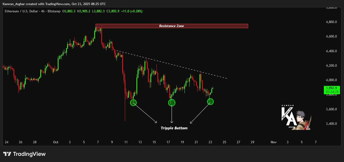 截至周四,以太币的4小时图显示出一个三重底形态,这种形态在价格三次触及同一支撑位并每次都未能跌破时形成。