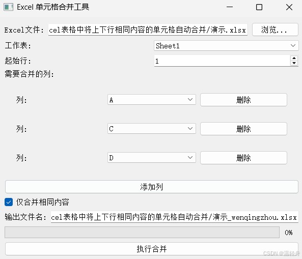 本项目是基于 pyqt5 和 openpyxl 的图形化界面工具。用于合并 excel 文件中指定列的相同内容单元格,允许用户选择 excel 文件、指定工作表、设置起始行、选择要合并的列,并控制合并行为