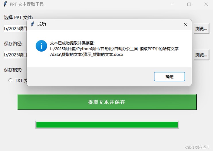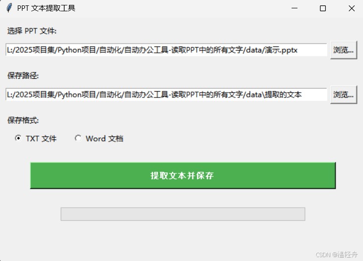 本项目是基于 tkinter 图形界面的 ppt 文本提取工具,主要功能是从 ppt文件中提取所有文本内容,并支持将提取的文本保存为 .txt 格式 或 word 文档(.docx)