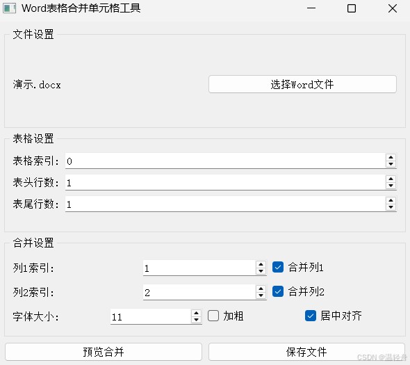 本项目是基于pyqt5和python-docx库开发的图形界面应用程序,用于处理word文档中的表格,主要功能是合并指定列中内容相同的单元格,并支持多种格式设置选项