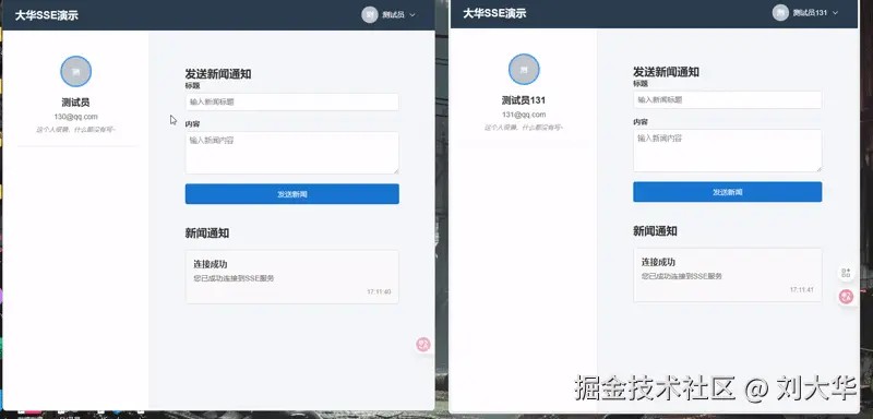 - 在任意浏览器发送新闻:两个浏览器都立即显示新新闻