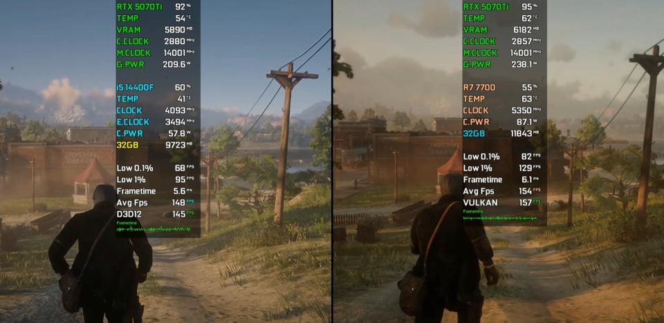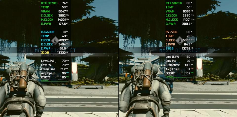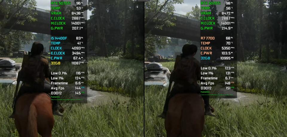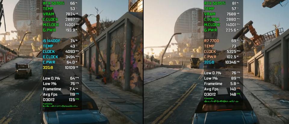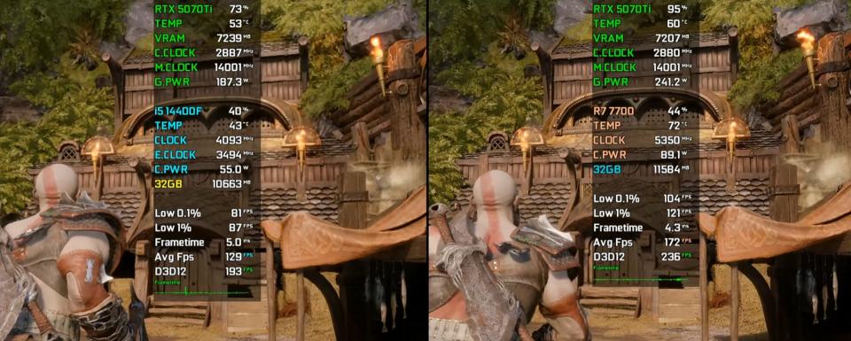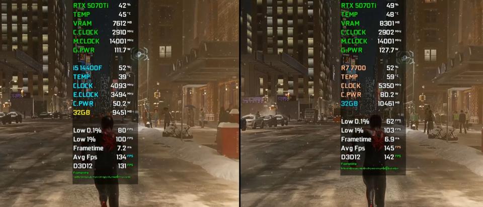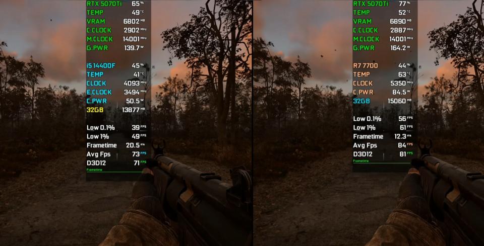 以下将分别测试七款游戏,均采用1080p画质模式,以下系列图片中左边代表core i5-14400f平台,右边代表ryzen 7 7700平台。