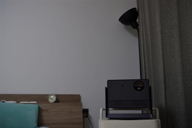 但比较遗憾我家并没有设计预留投影仪的安放位置和幕布,也没有当贝s7 ultra pro投影仪专用的落地支架,最后我只好用宜家的小推车来临时承载一下当贝s7 ultra pro投影仪,摆放位置也只能因陋就简,放在床头柜前面,斜对对面的墙面,直接在墙面上投影使用。