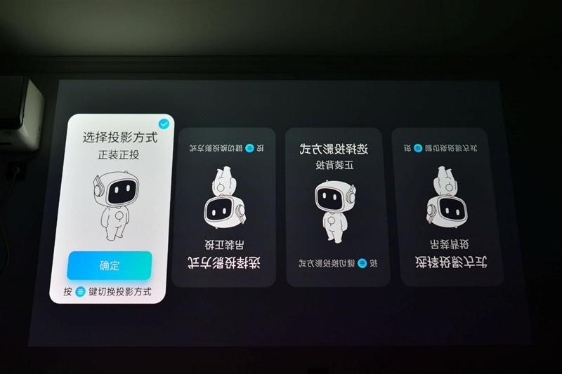 初次启动时当贝s7 ultra pro投影仪会提示选择正确的投影方式,当贝s7 ultra pro投影仪支持正装吊装、正投背投共计四种安装方式,我们现在直接使用默认的正装正投就好。