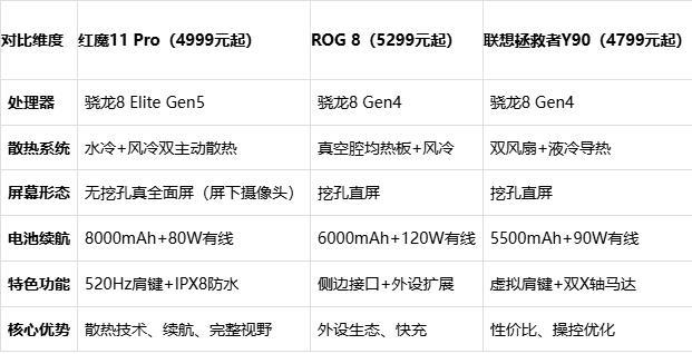 结论:红魔11 pro在散热与续航上碾压竞品,适合追求持久高性能的硬核玩家;rog 8胜在外设生态,拯救者y90则以低价满足基础游戏需求。