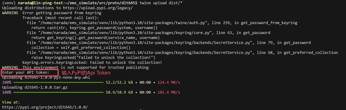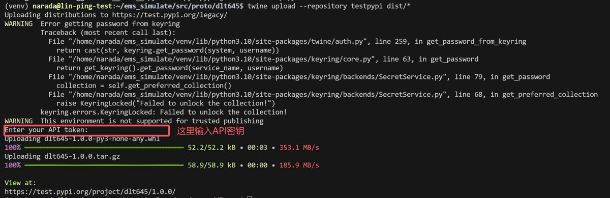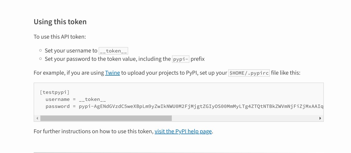 ~/.pypirc文件:[distutils] index-servers = pypi testpypi [pypi] username = __token__ password = pypi-your-api-token-here [testpypi] repository = https://test.pypi.org/legacy/ username = __token__ password = pypi-your-test-api-token-here
