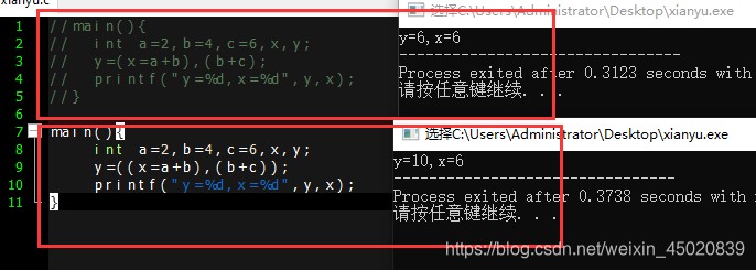 int a=2,b=4,c=6,x,y; y=(x=a+b),(b+c); x=6 ;y=6 y=((x=a+b),(b+c); x=6 y=10