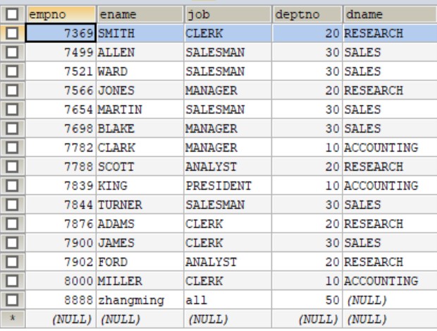 create view view_emp_dept as select e.empno,e.ename,e.job,e.deptno,d.dname from emp e left outer join dept d on e.deptno=d.deptno-- 红色部分和之前左外连接一样