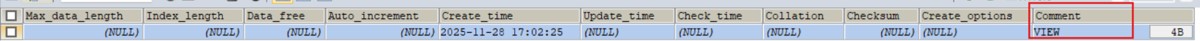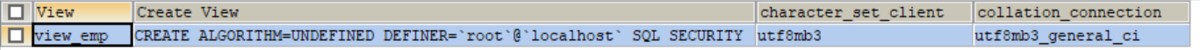 show table ststus like '视图名';-- comment 值为view说明是视图,为空则不是 show table ststus like'view_emp';