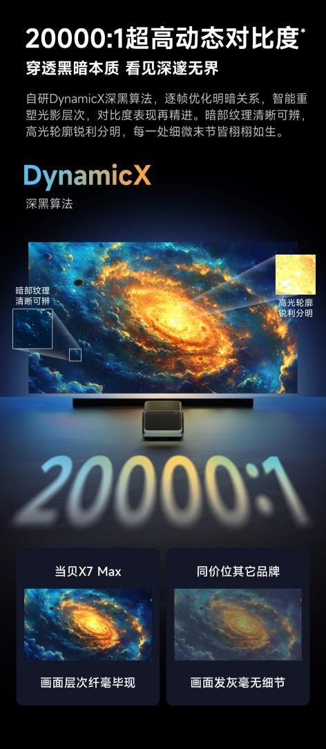 在对比度这一块,当贝x5s max和当贝x7max都使用了当贝自研的dynamicx深黑算法,当贝x5smax对比度达到了10000:1,而当贝x7max进一步将对比度提升至20000:1,暗部细节层次感更强,黑位更深邃,彻底告别普通投影仪“发灰”的现象。