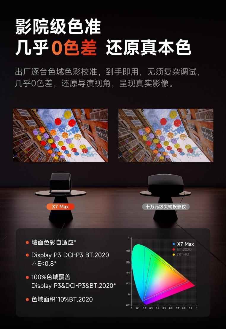 在亮度方面,当贝x5s max使用alpd激光,亮度达到2800 cvia流明,当贝x7 ma采用2组qualas 32激光器,并且采用了独特的光路黑化设计,进一步将亮度提升到了3000 cvia流明。更强的亮度和抗光性,让投影仪在客厅开灯观影或者白天观影的场景下也能投出清晰明亮的画面。