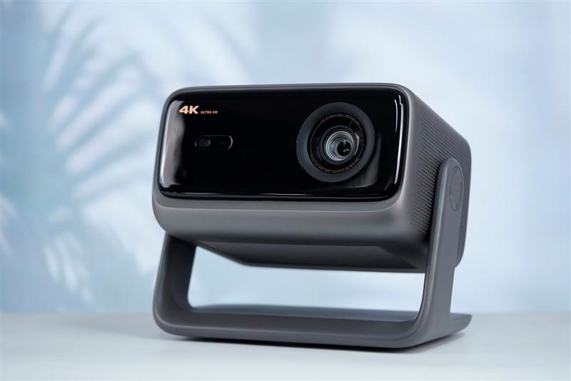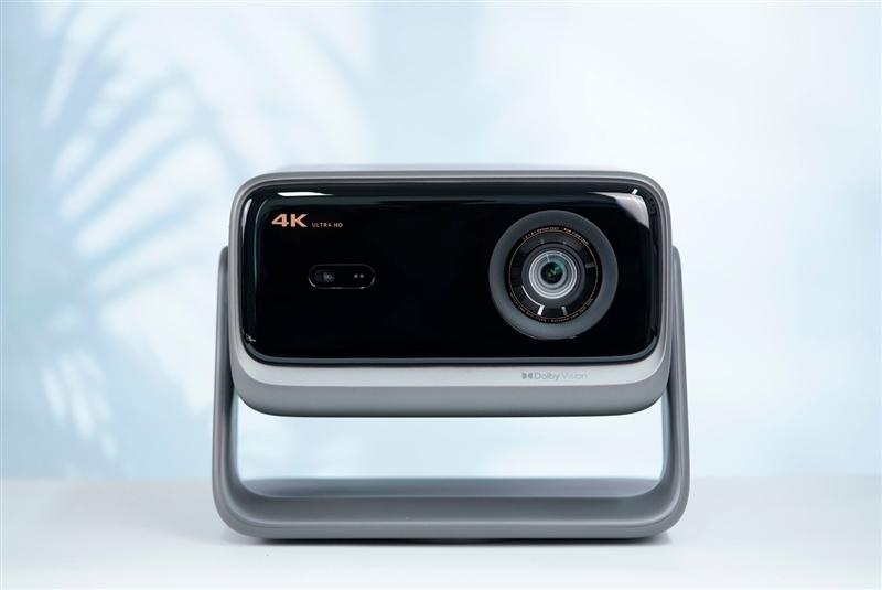 当贝x7 max投影仪机身使用了深灰色外壳,正面面板采用了黑色高亮设计,镜头布置在右侧,左侧则布置了一组辅助传感器摄像头和醒目的4k ultrahd字样。