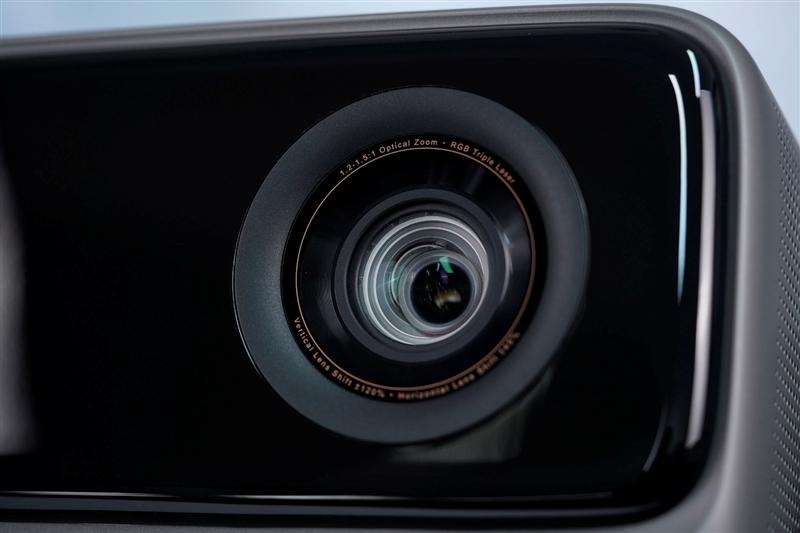 当贝x7 max投影仪搭载了一枚超透晶钻大师镜头,透光率达到99.6%,画面更加清晰锐利。镜头边缘的小字标注了镜头的参数,包括1.2-1.5:1的透射比,三色激光光源,以及水平120%和垂直45%的平移调节范围。