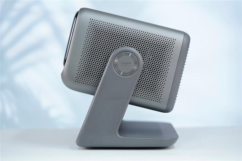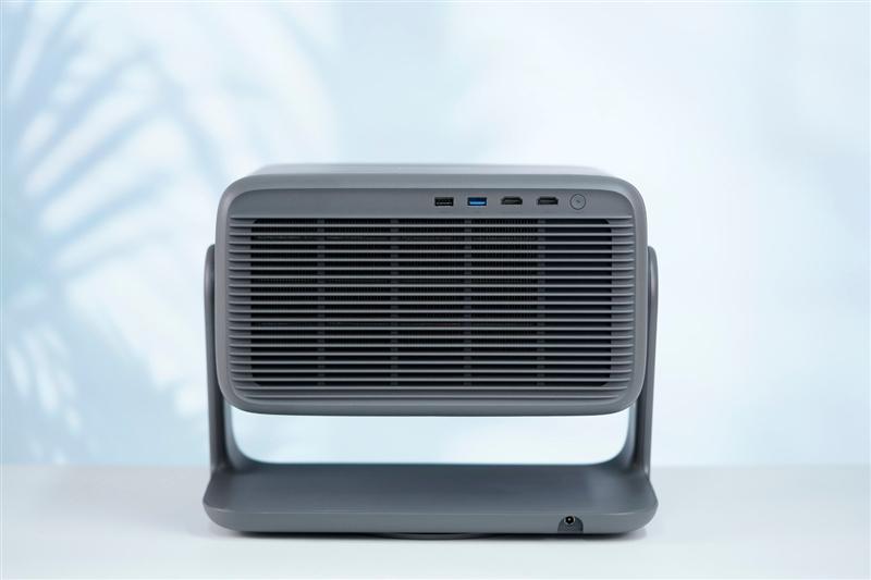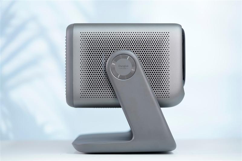 当贝x7 max投影仪机身背面是大面积的散热格栅,主要接口和电源键都布置在背面右上角,电源接口设计在了云台的底座部分,让云台的摆放和调整更加灵活不受限。