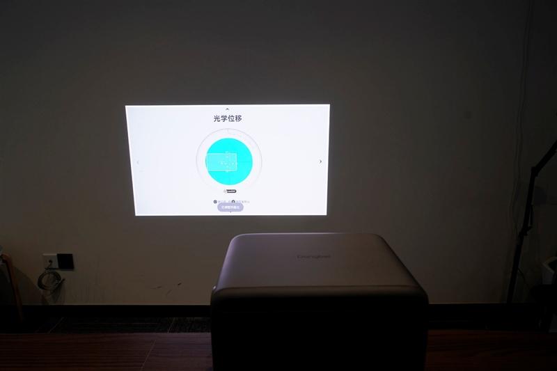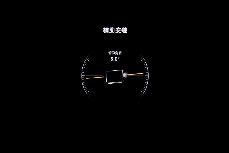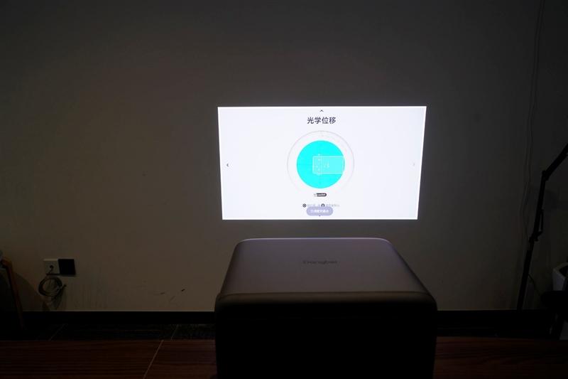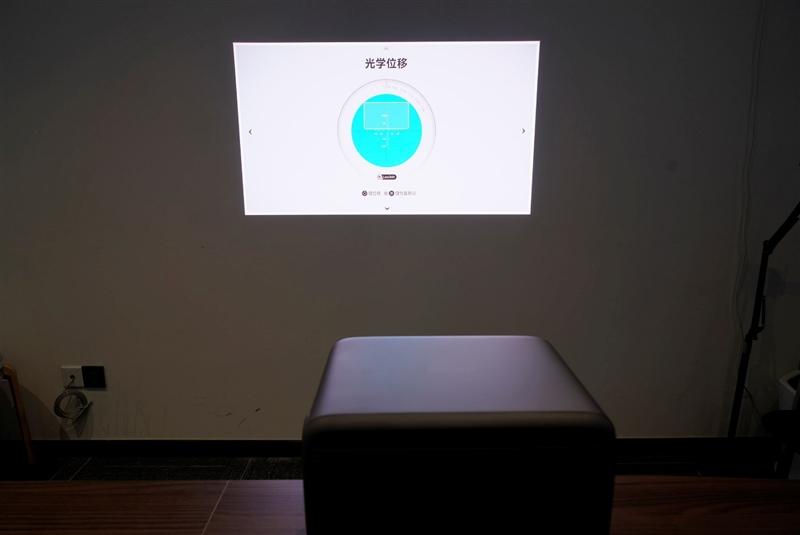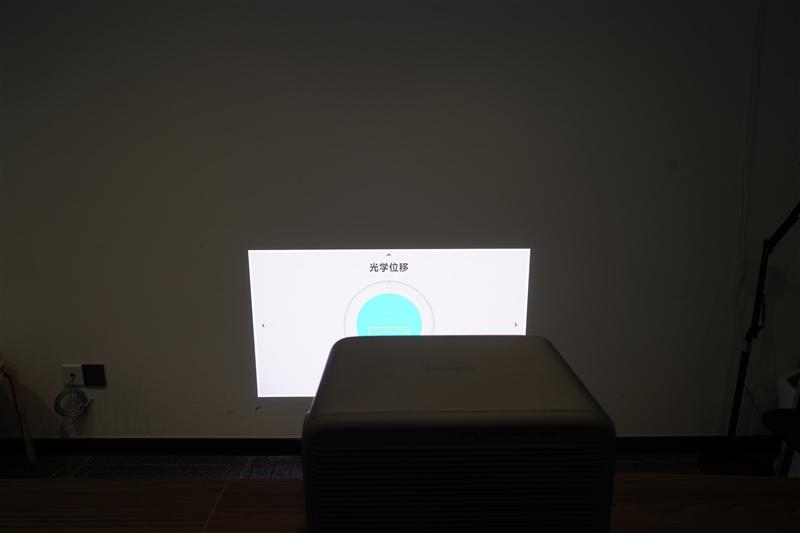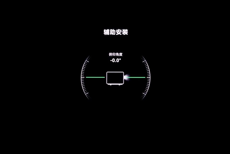 为了最大限度的利用这一新功能,我们先在辅助安装功能中,将投影仪的俯仰角度调整到0度,保持投影画面的焦平面和墙面平行重合,之后就可以在光学位移菜单中进行画面平移控制了。
