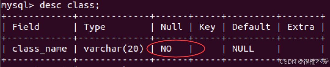 非空约束有两个值:null(默认的)和not null(不为空)。