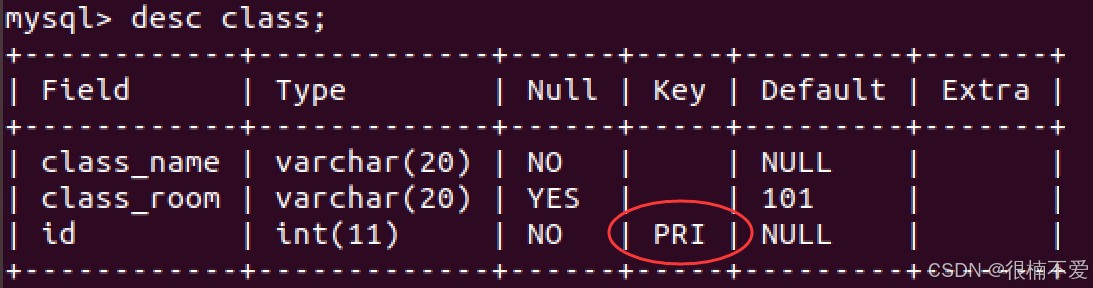 主键:primary key用来唯一的约束该字段里面的数据,不能重复,不能为空,一张表中最多只能有一个主键;主键所在的列通常是整数类型。