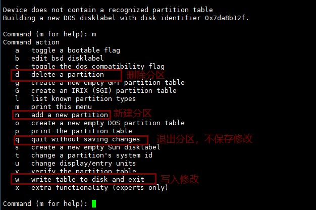 1、执行fdisk命令,之后将进入fdisk交互式命令行界面。