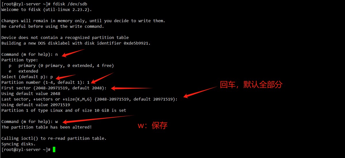 6、输入 w 确定分区,保存更改并退出fdisk,不然不会生效。