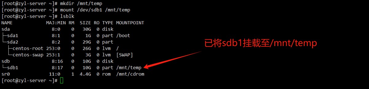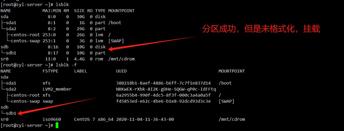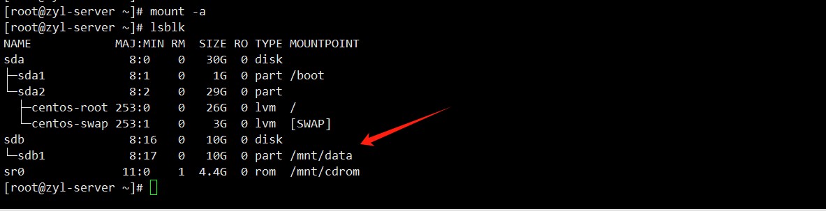 [root@zyl-server ~]# lsblk name maj:min rm size ro type mountpoint sda 8:0 0 30g 0 disk ├─sda1 8:1 0 1g 0 part /boot └─sda2 8:2 0 29g 0 part ├─centos-root 253:0 0 26g 0 lvm / └─centos-swap 253:1 0 3g 0 lvm [swap] sdb 8:16 0 10g 0 disk sr0 11:0 1 4.4g 0 rom /mnt/cdrom [root@zyl-server ~]#