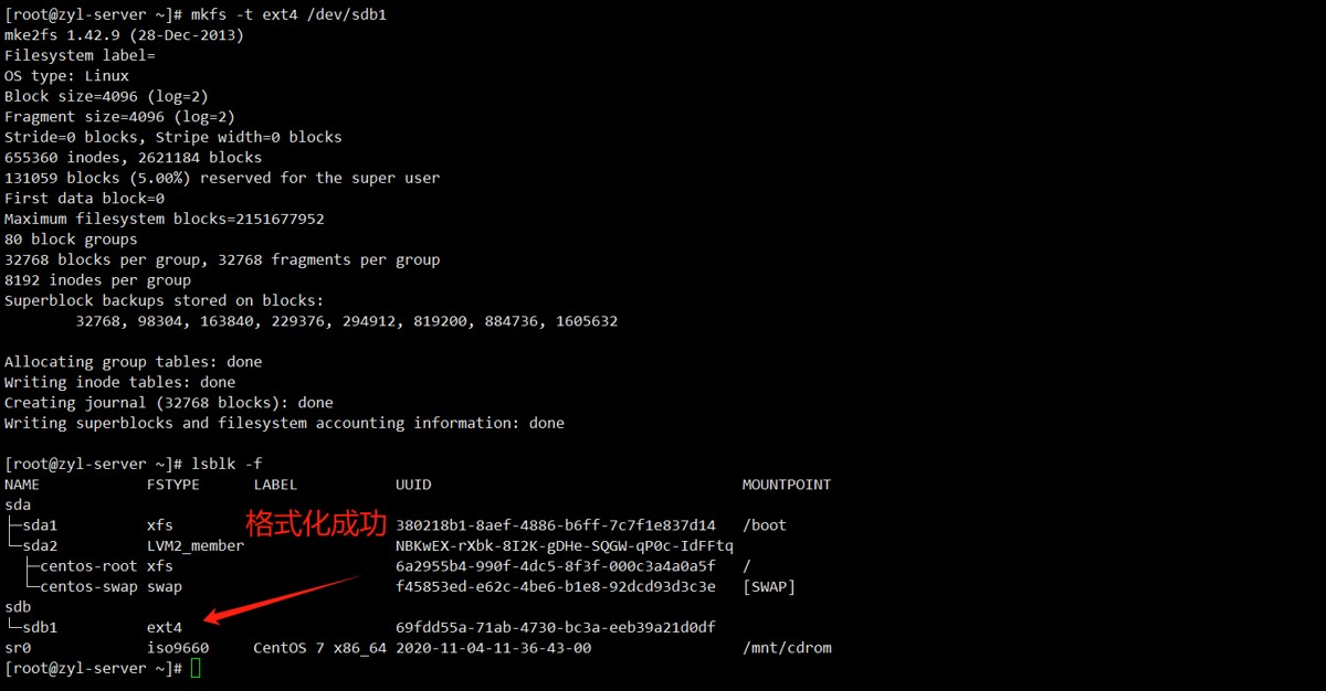 2、对 /dev/sdb1 分区使用 ext4 文件系统进行格式化,(sdb1是sdb磁盘分区后得到的)。