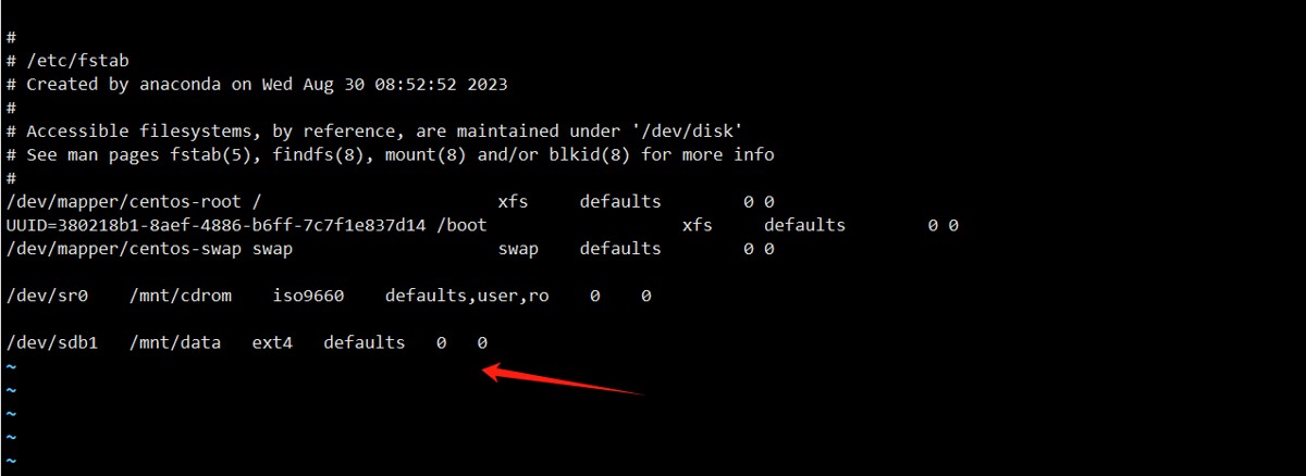 在文件末尾添加一行来描述要永久挂载的分区。例如,假设要永久挂载 /dev/sdb1 到 /mnt/data 使用 ext4 文件系统,添加如下内容: