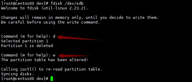 fdisk /dev/sdb执行之后,输入d表示删除分区,然后输入w确认更改。
