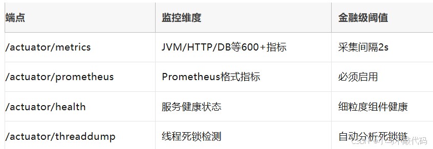 /actuator/prometheus端点以prometheus格式输出指标数据,这种格式具有良好的结构和可读性,便于prometheus直接抓取和存储。在生产环境中,这个端点是必须启用的核心功能,它为整个监控体系提供标准化的数据输入。