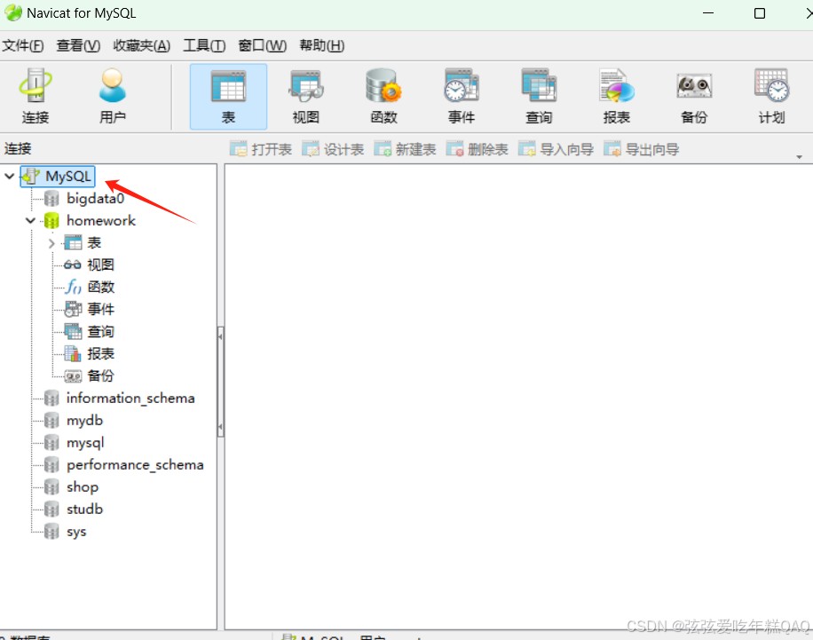 右击mysql-------》新建数据库--------》填入数据库名(我的叫:homework)–确定