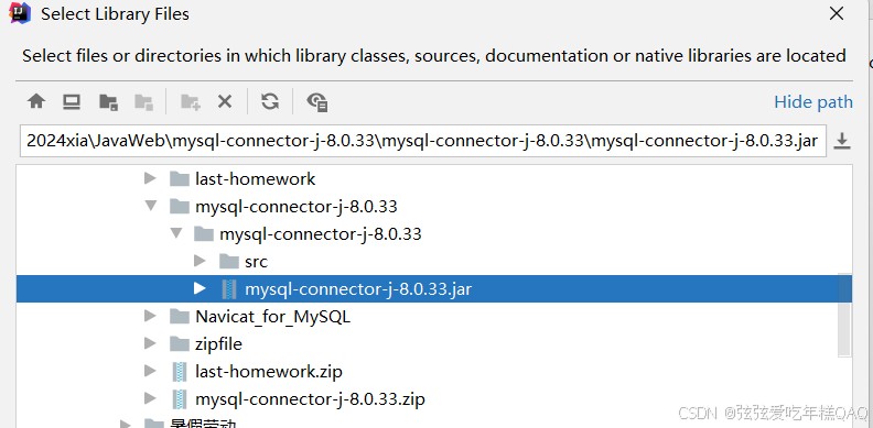 点击后在你的电脑中找到你的驱动包(没解压的解压)例如我的路径长这样,选中.jar文件–点ok