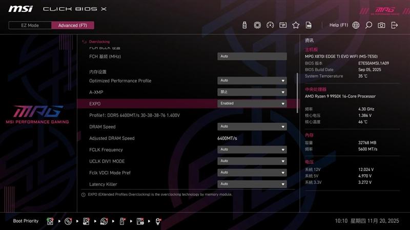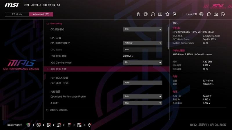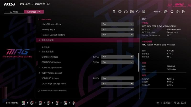 微星mpg x870i edge ti evo wifi 刀锋 钛主板bios中的超频页面,提供了极为详尽的超频设置选项,方便超频玩家对系统性能进行精细的调整,充分发掘性能潜力。