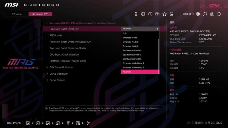 pbo limits设置为主板,由微星mpg x870i edge ti evo wifi 刀锋 钛主板对cpu进行控制,可以最大限度释放